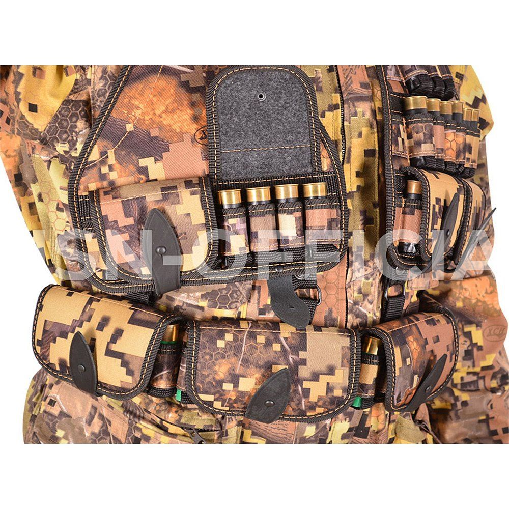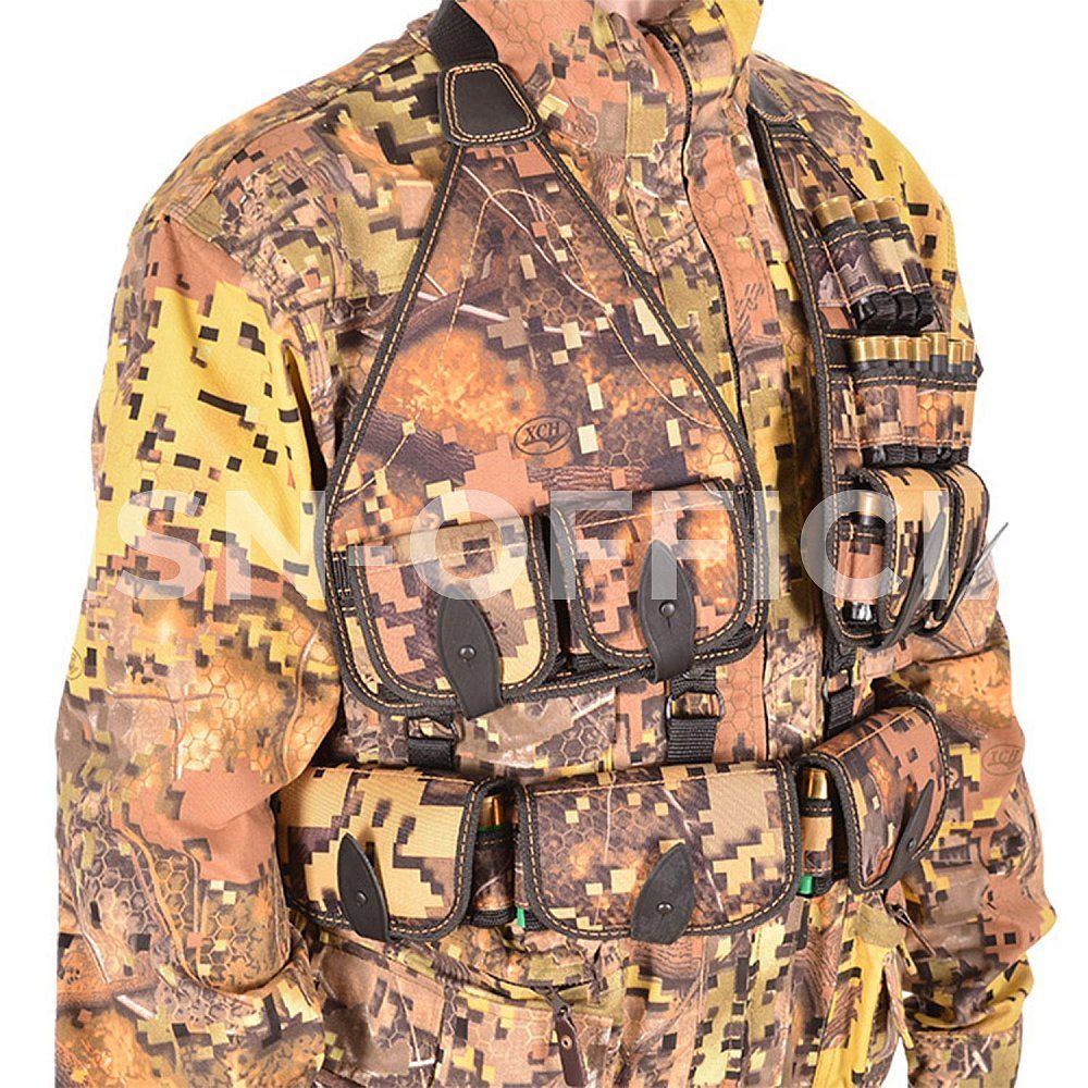 Изготовлен из специальной ткани. Патронташ надежно держит 49 патронов в лузах. Позволяет загрузить патроны снаряженные в гильзы длиной от 70мм. до 89мм. Оснащен клапанами для защиты патронов от не погоды.